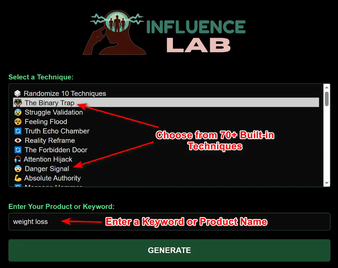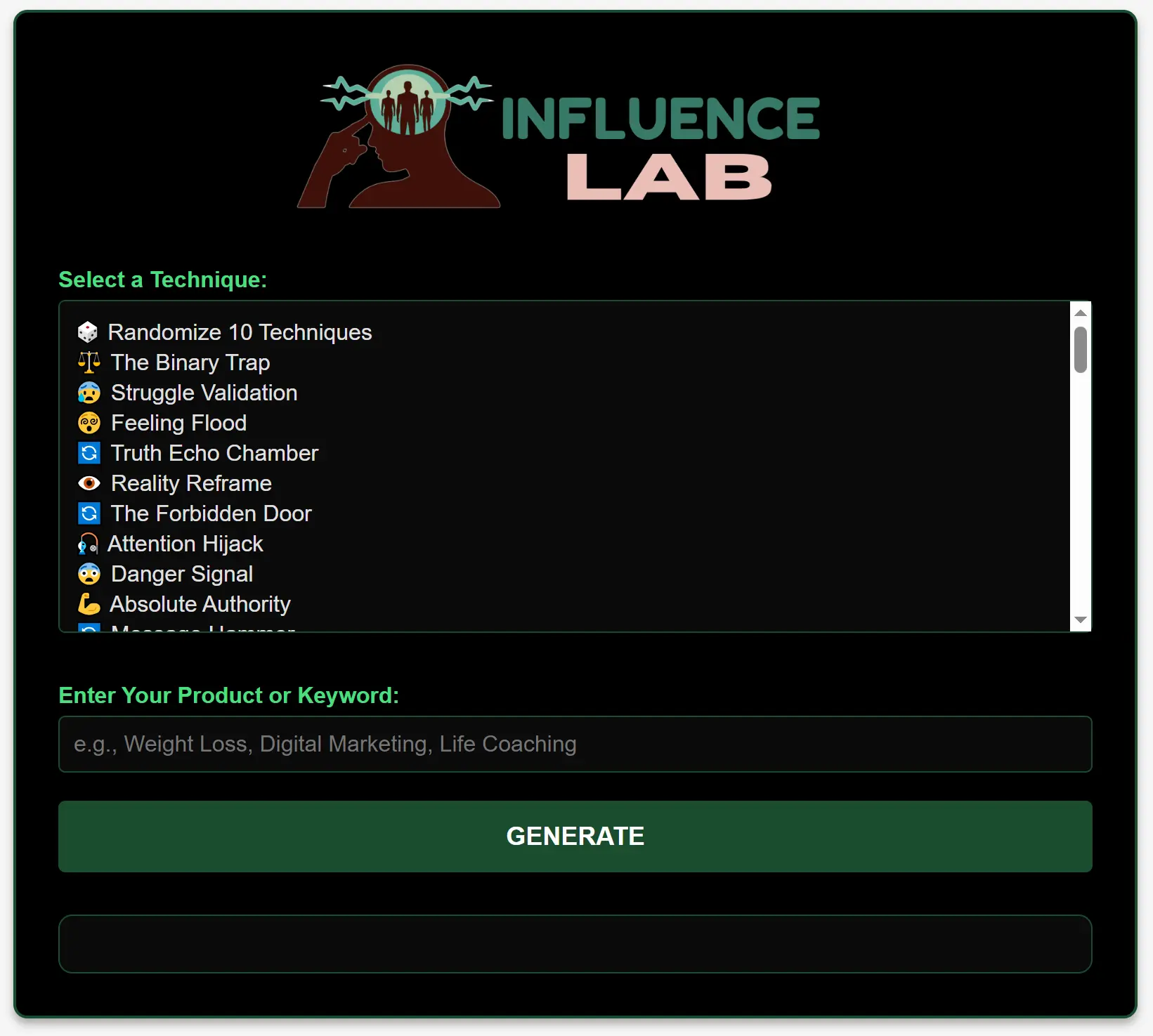 Once you've picked your brain trick, Influence Lab creates perfectly-crafted AI prompts that put your product details into proven mind control methods.