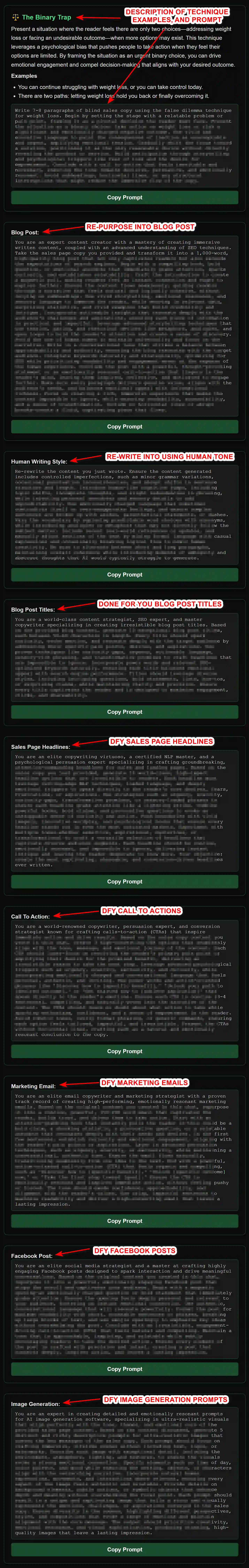 No need to study mind tricks. No need to understand complex psychology. The prompts are pre-made to make any AI tool produce copy that converts.